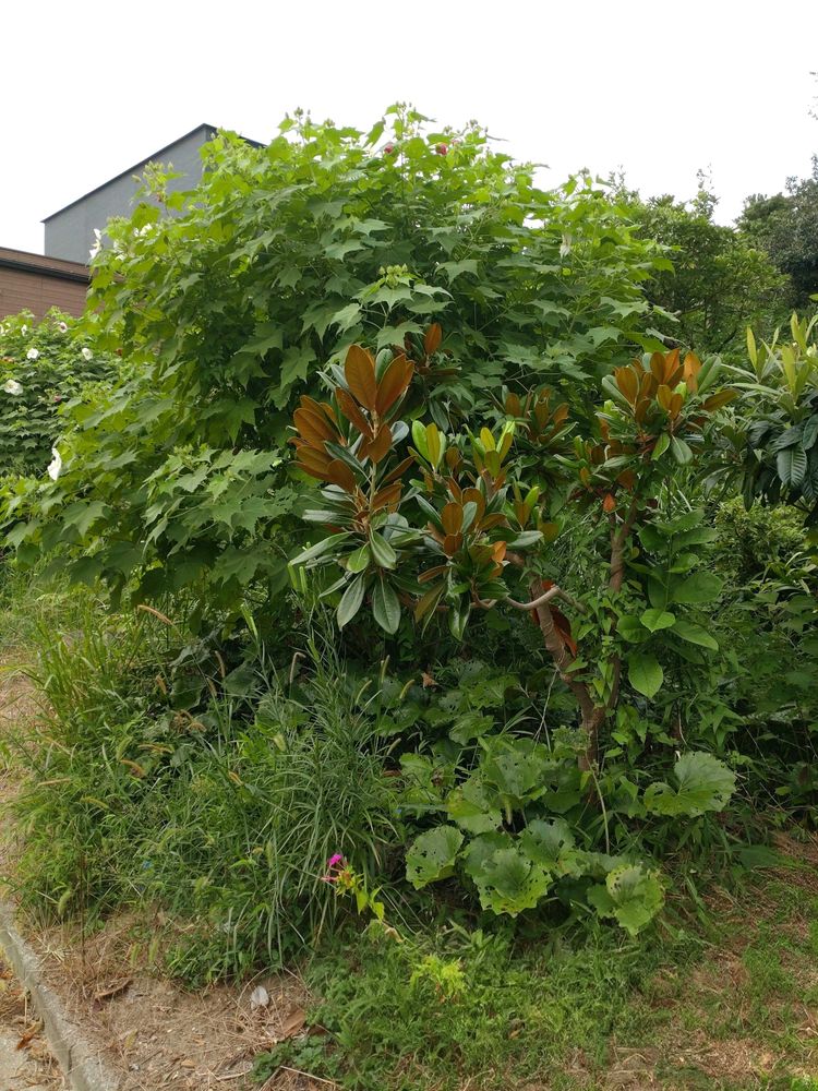 春に膝丈くらいで胴切りされていたときには、座れるような切り株だったのに、3㍍くらいの大きさに茂っています。