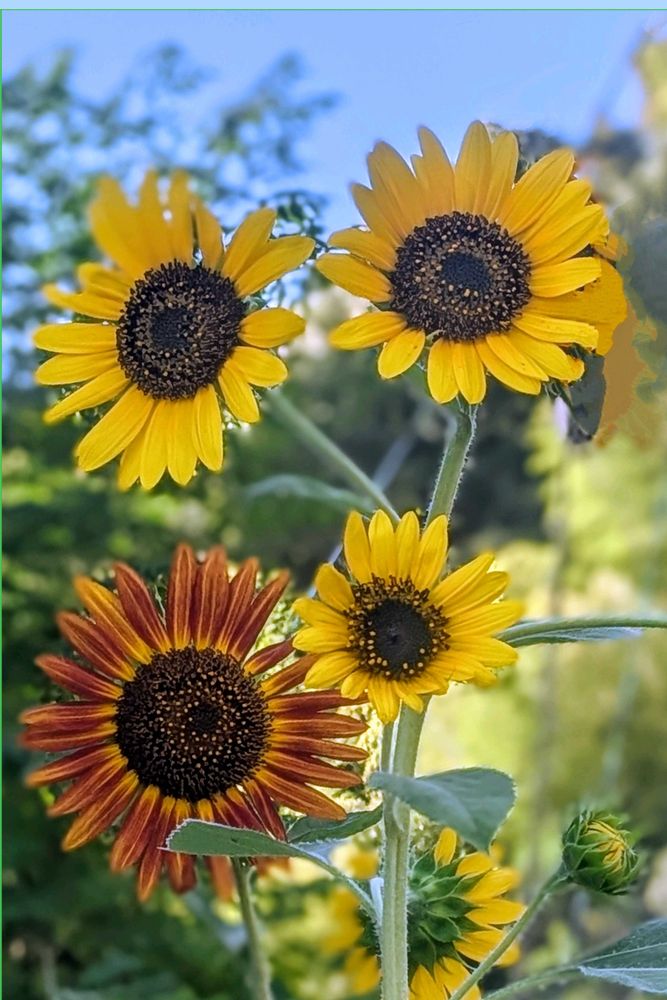 種蒔きして咲いてるヒマワリです。次から次へと花芽がでてきて咲いてくれております🟡🟠 🌻2枚目の赤色がかったヒマワリが咲いた時は嬉しかったです🟠🔴🤣😃