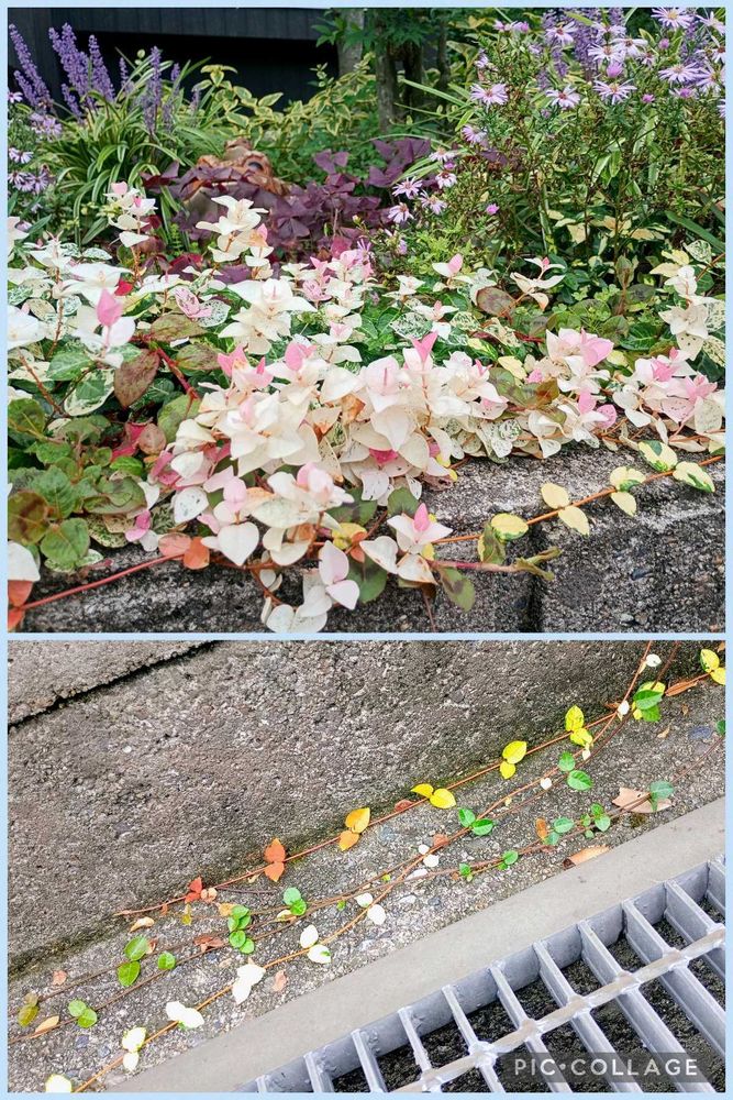 今朝は涼しいくらい、でも雨上がり 肌はシットリ💧ヒヤッと湿気を感じましたが、 🏡前に植え込んであるハツユキカズラが…、花壇から下へ這い下がり 〰️💚💛🧡🍃〰️と、秋めいた雰囲気。