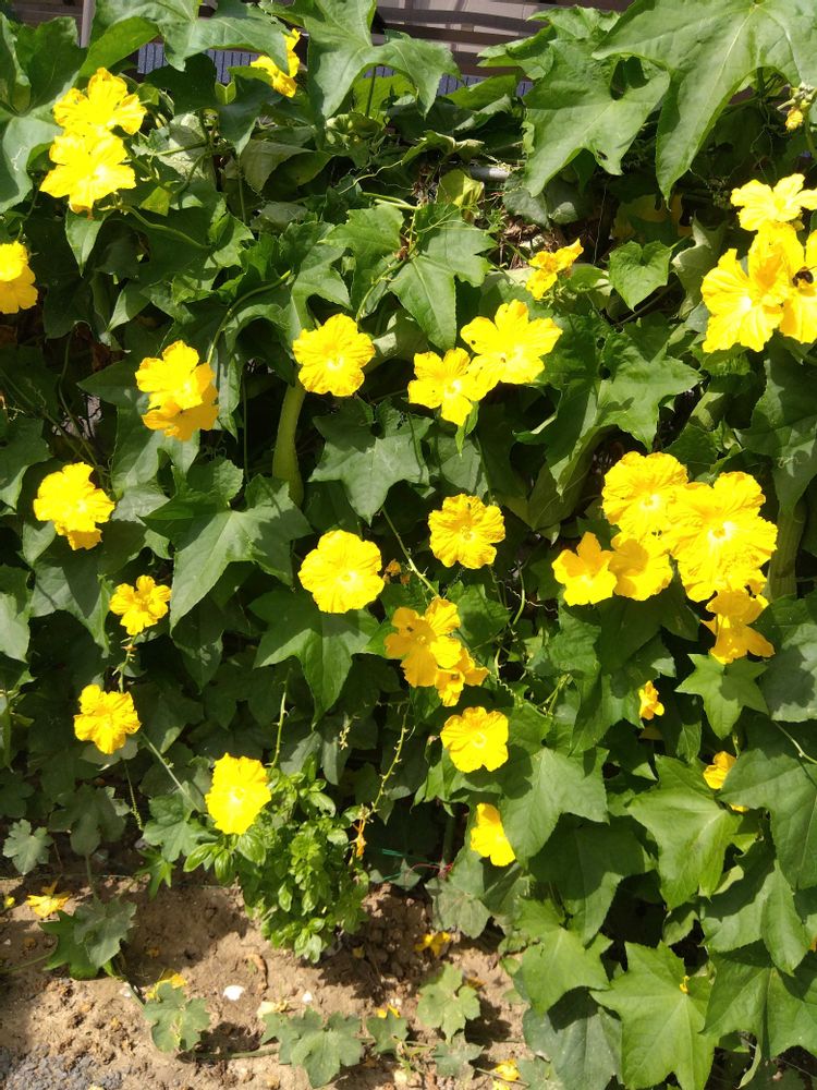 今朝行った喫茶店の庭の垣根にヘチマの花がたくさん咲いてました(☆∀☆)キラーン!