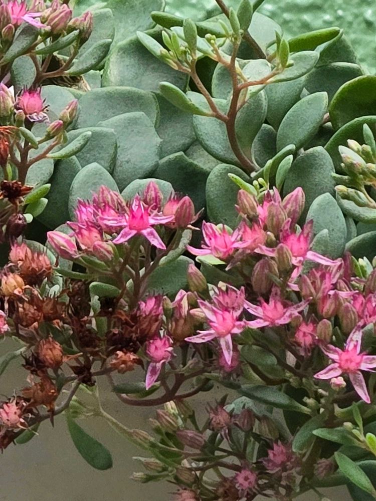 猛暑を乗り切った雨ざらし日高ミセバヤさんがモリモリに🥰 早く咲いたお花はコゲが見えますが蕾も沢山出ていてこれから咲くのは綺麗🩷かな〜👏🩷