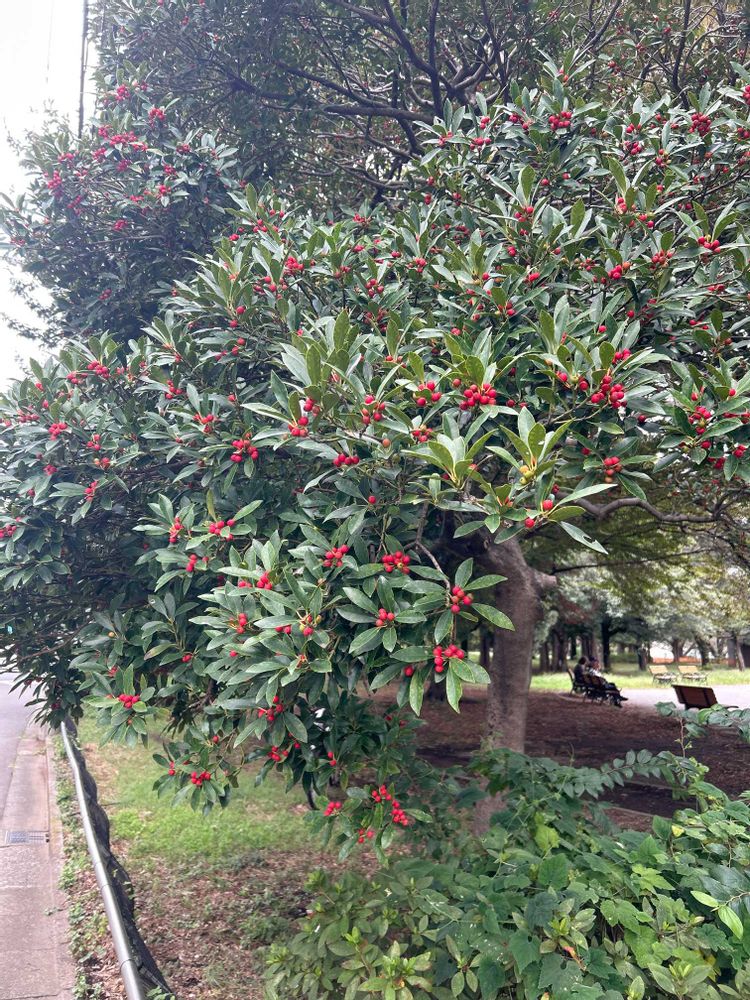 東京都の公園、初夏から青い実をつけていました。カナメモチにはしては実が大きいです。
