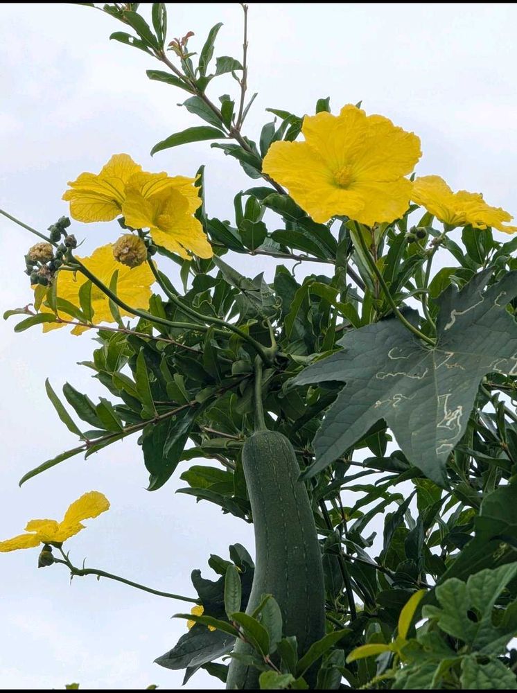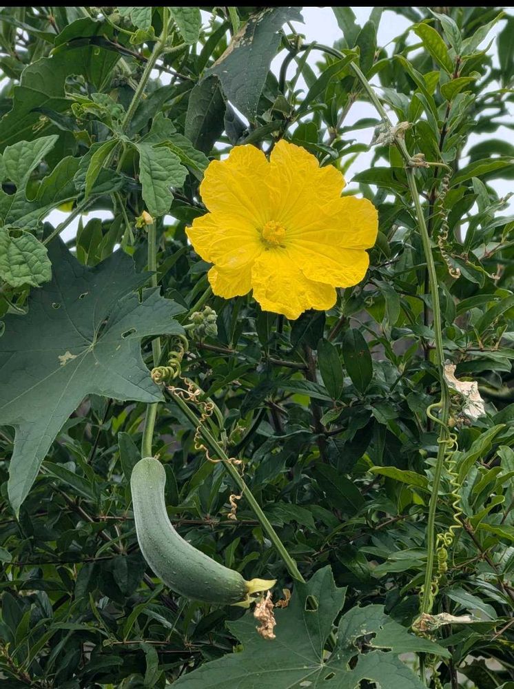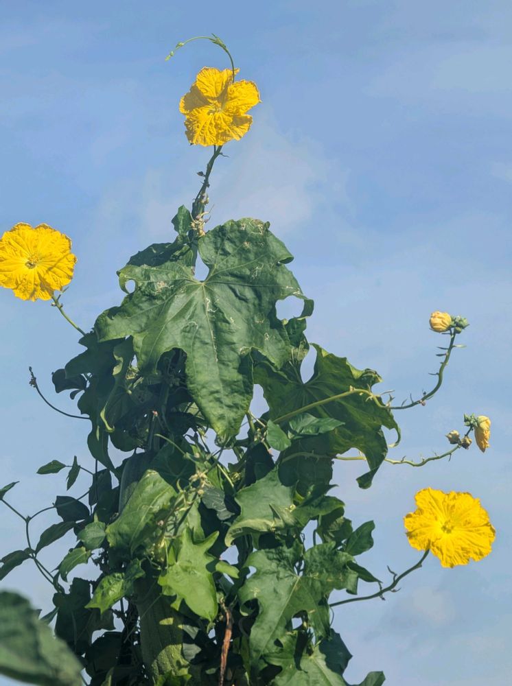 ビタミンカラーの糸瓜が青空に映えてとても綺麗〜実りが楽しみですね〜昔、お汁に入ってる糸瓜が苦手でしたが味噌炒めは好物です〜タワシも沢山出来そう〜🎶🤭