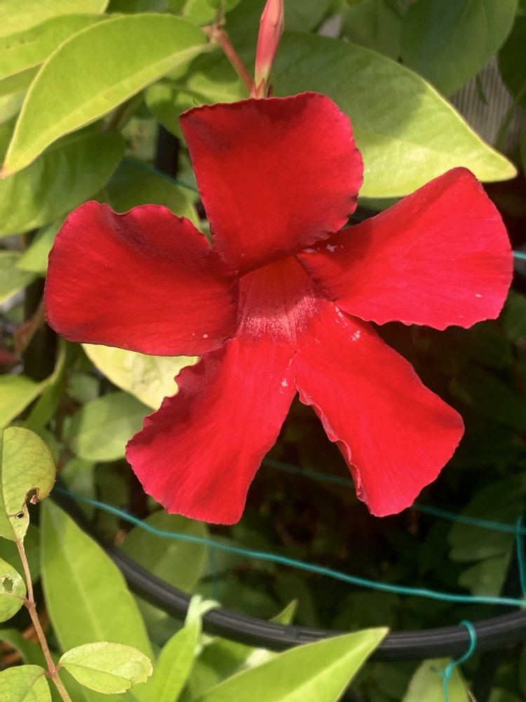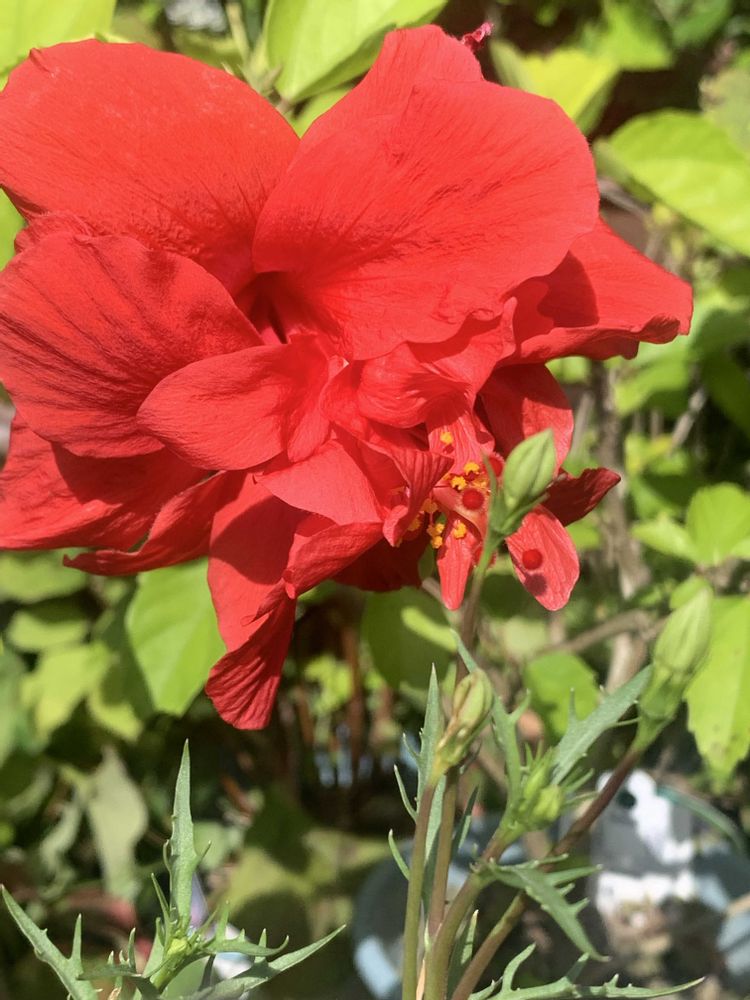 秋というより真夏みたいな鮮やかさ❣️八重咲ハイビスカス🌺、斑入りペンタス、クライミングサンパラソル大輪レッド