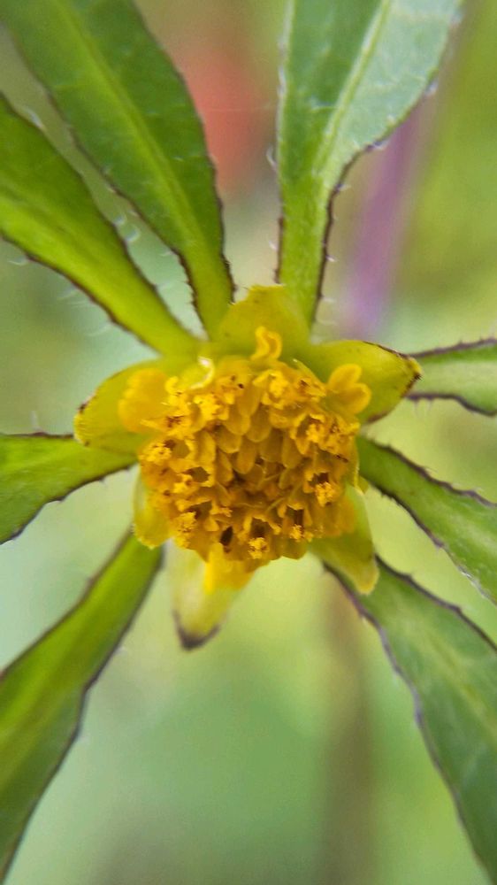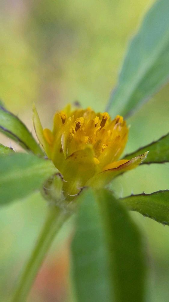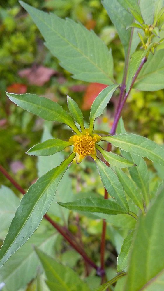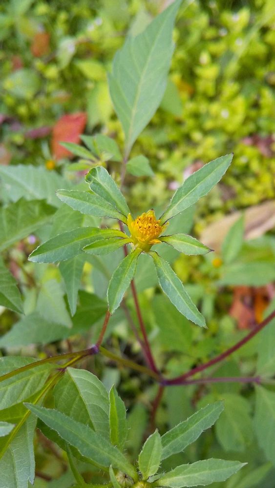 アメリカセンダングサかと思われます 山裾にあたる林縁の 流れ出た山水が溜まった湿地に 黄橙色の花を咲かせているのを見付けました 百均マクロレンズで撮ってみると 小さな筒状花が集まって咲いており 総苞片が目立ちます 良く似たタウコギという花があるようですが 葉柄や翼の有無はあまりはっきりしないのものの 茎が紫色を帯びていて細いという特徴などから アメリカセンダングサと判断しました 違っているようでしたらご指摘ください