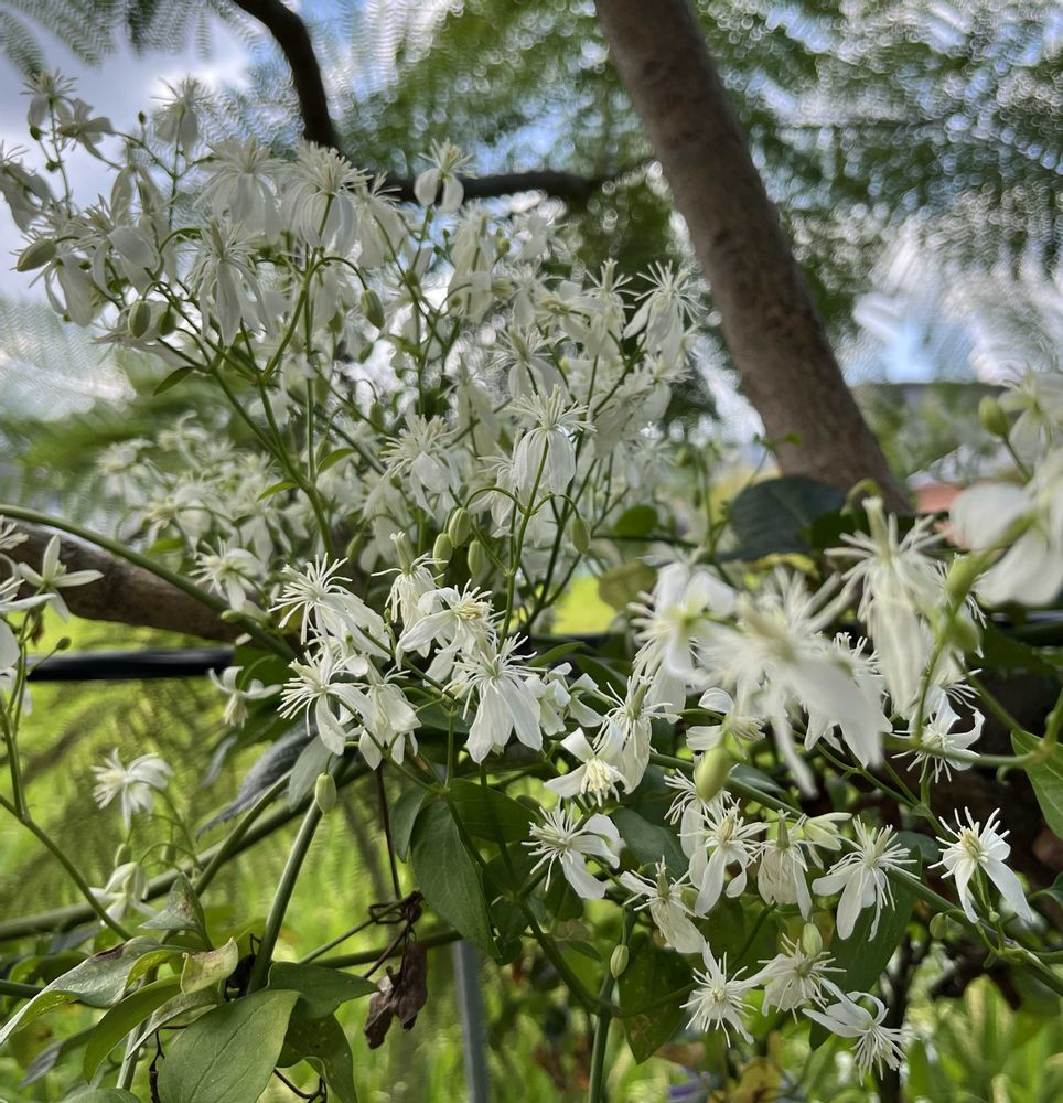 センニンソウは小さな鉢植えなのにジャカランダに巻きつき巨大化してびっくり😳