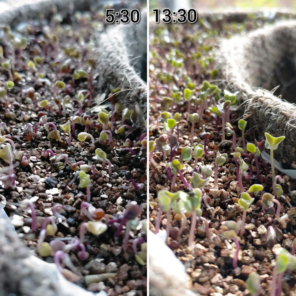 【2枚目】こちらは昨日9月18日早朝の様子で、まだ緑化しておらず黄色いですが続々と殻を破っていました。さすが葉牡丹、すごく早いです。