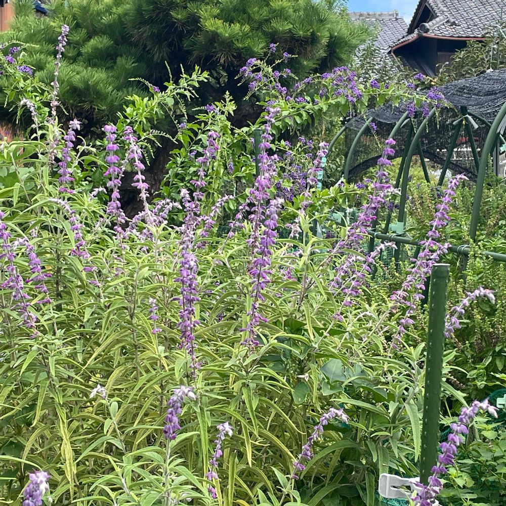 お隣さんから覗いた アメジストセージ💜奥には2本目のデュランタ宝塚も見えた🤭