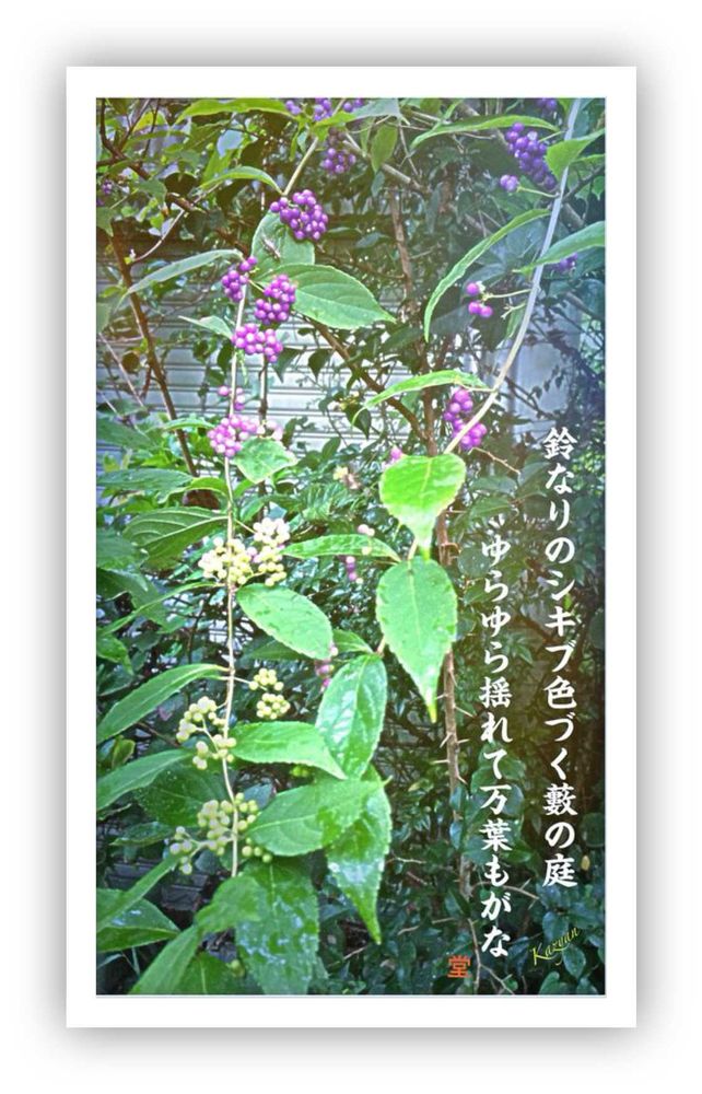 訳意:鈴なりのムラサキシキブの果実が色づきはじめ、藪庭に"万葉の風"が吹いているのか、ゆらゆらと揺れて戯れているようです。