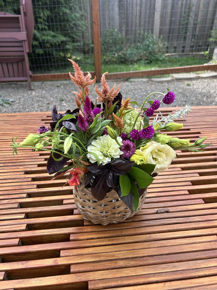 花材: ケイトウ、ジニア、千日紅、スカビオサ、シロタエギク(ダスティミラー)、レッドバジル、トルコキキョウ、丸葉ルスカス、小菊、ノリウツギ