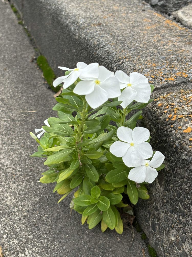 相棒のDAHON🚲と近場を走っていたら、道路と縁石の間に咲いている日々草(ニチニチソウ)を見つけました。根性あるな😄