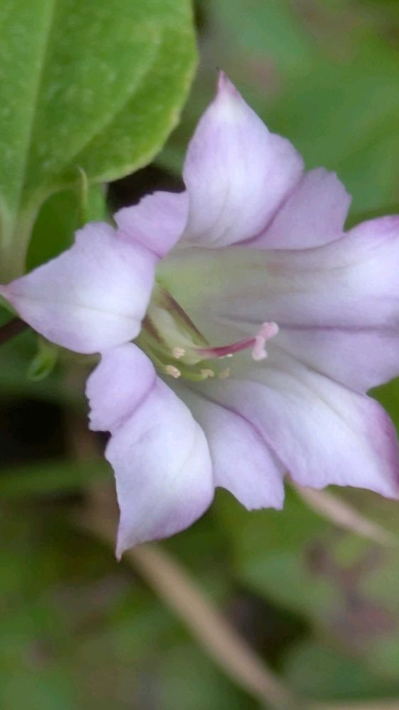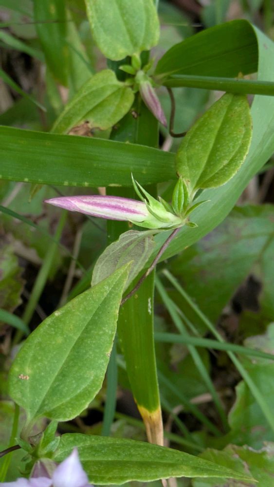 細長い葉には3脈が目立っていて、裏側はうっすらと紫色を帯びて、ツルの色もちょっと紫🟪