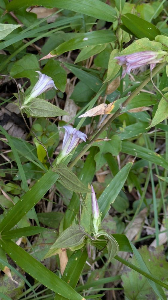 葉腋に一つずつ花がついて、地を這ったり、絡みつかなかったり、近くのササなどに巻きついて伸びたりしています🌀