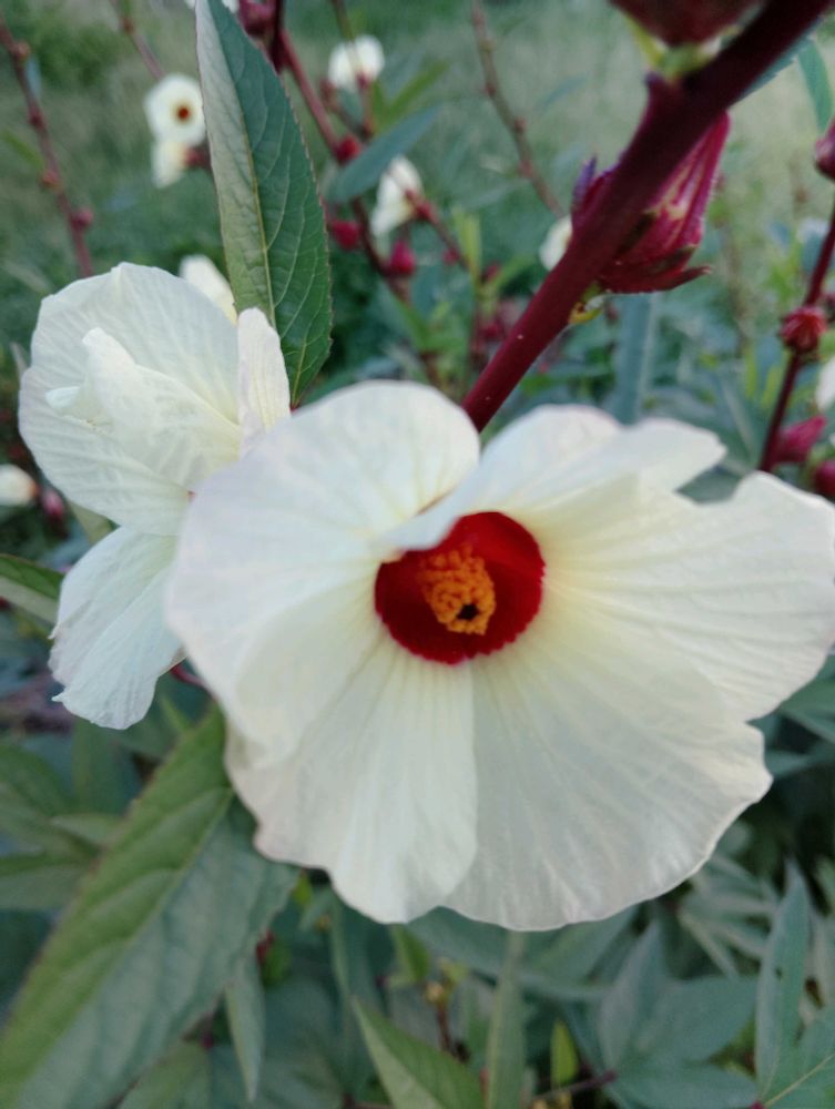 ローゼルと出ました。白に中心が赤で可愛らしい花です。