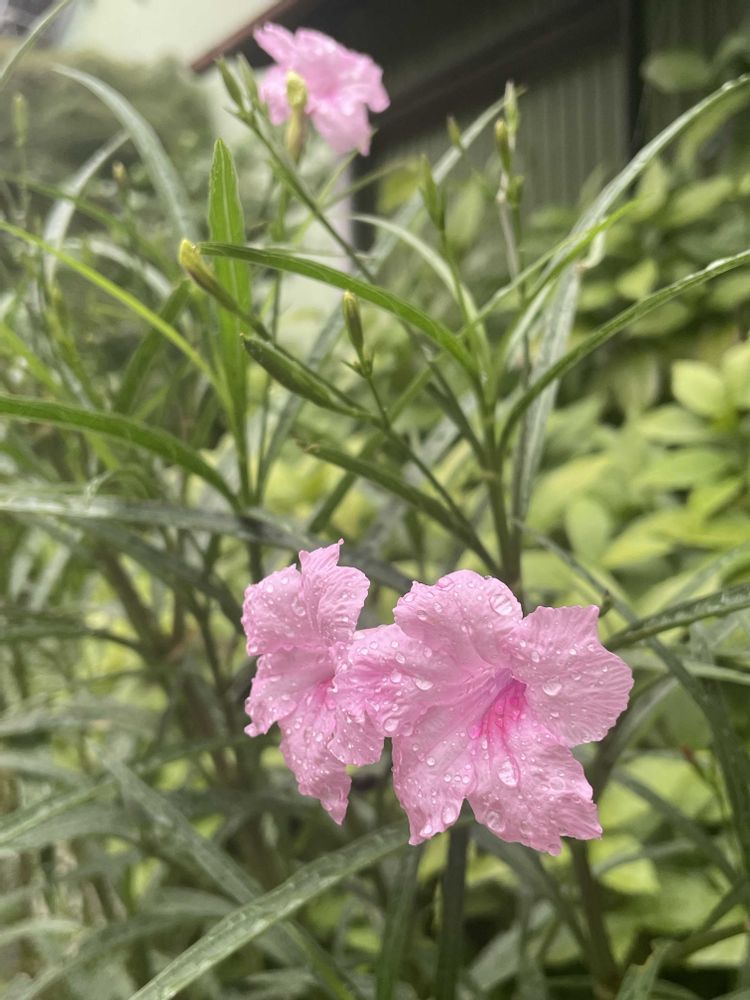 ピンクの ルエリア(ヤナギバルイラソウ)が雨上がりに可愛らしく咲いています 去年から10号鉢のままなので根詰まり気味 すぐに水切れしてしまいます😅