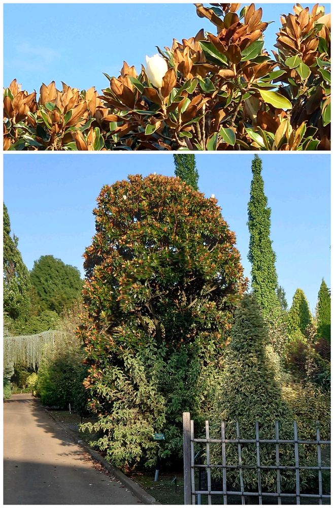 大きなタイサンボクの木🌳 もうとっくのとっくに花はさ終わっていたんですけど、遠目から眺めていると、てっぺんに怪しい白いものが2つ🙄👀 なんと、これから咲く準備をしているようです😱