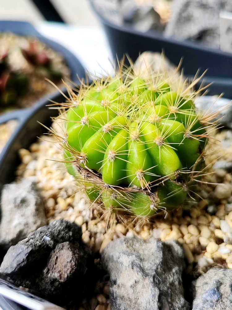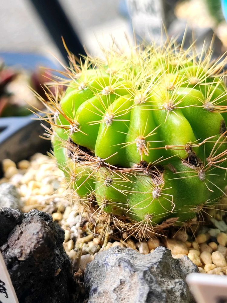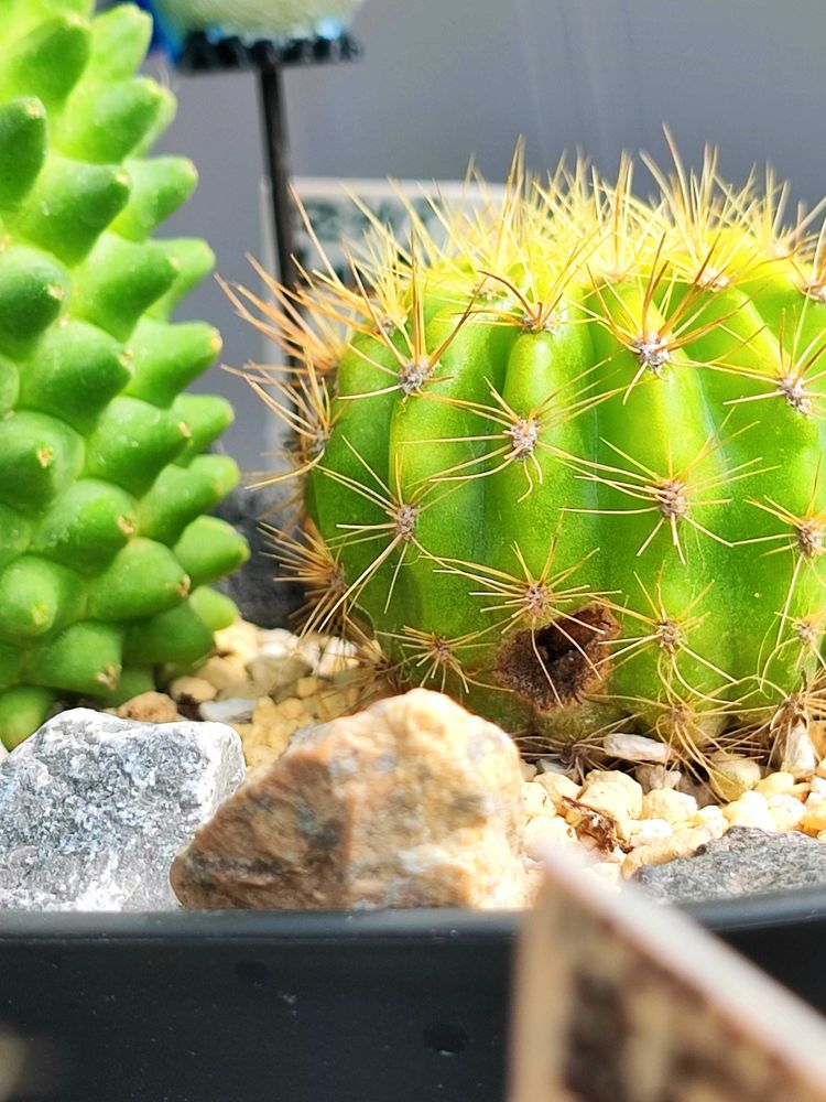 本日のサボテン。金盛丸(多分)。2024年の冬にダイソーで買った時から割れてた&穴あきですが、元気そうなのでそのまま育てています。割れの方盛り上がって修復されてきた?ような?気もしないでもない。