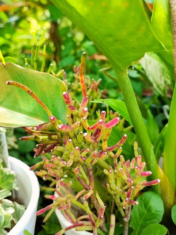 あと2023年?くらいから育てている森林サボテン(ハティオラ?)の猿恋葦?も茂みの中で地味に育ってます。ほとんど情報がなくてアレなんですが、一応、森林サボテンということは分かっているので明るい日陰&湿度高めで育ててますが、ストレス色出てる(赤くなってる)ので、明るすぎるか暑すぎるのかもね…(何もしないけど)
