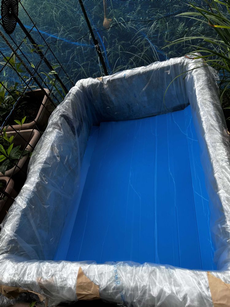 わずかな水漏れが見られるので ハウス用のビニールを掛けパネルを水槽の底に敷き