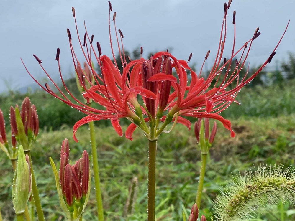 微雨の中草刈りをしていたら彼岸花が咲いていました