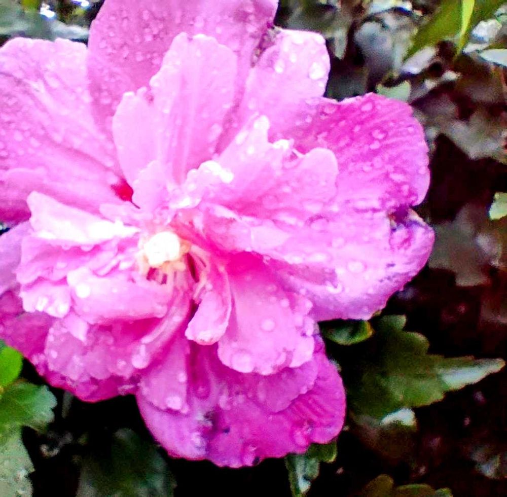 ムクゲ🌸八重咲きで雨粒がたっぷり💧💧