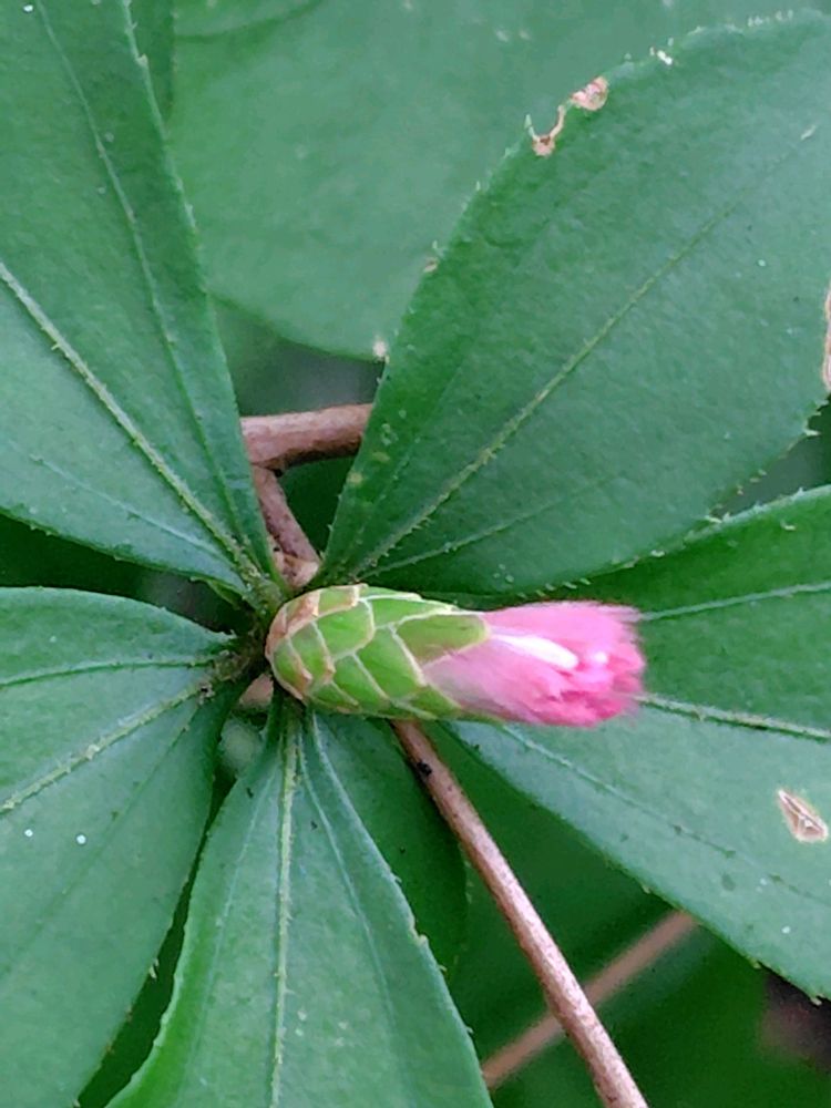 2年枝な茶緑。葉は束生で長楕円形で先が尖り、葉縁には鋸歯があり、両面とも無毛。