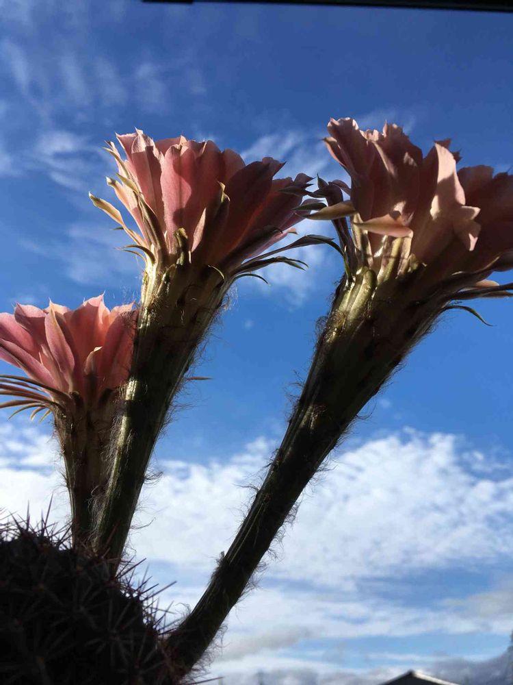 凄い~!しかもピンク!!素敵ーーーっ!!! ひとつの玉から3つも咲いているのですか?? ウチの金盛丸くんとトゲ感と毛むくじゃら感が似ているけど、色が違うから、別の品種なのですよね、きっと^^*