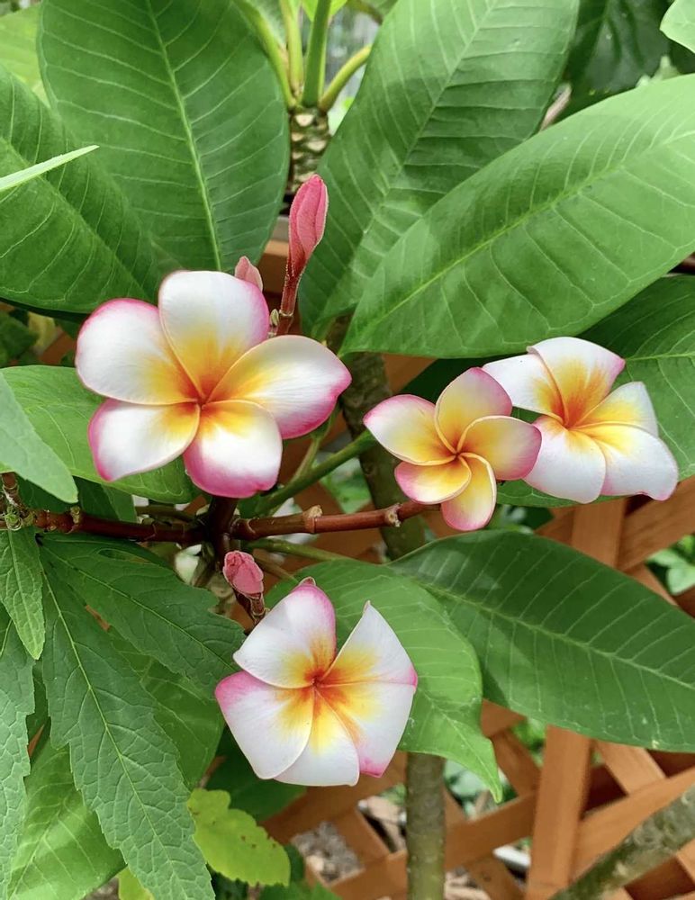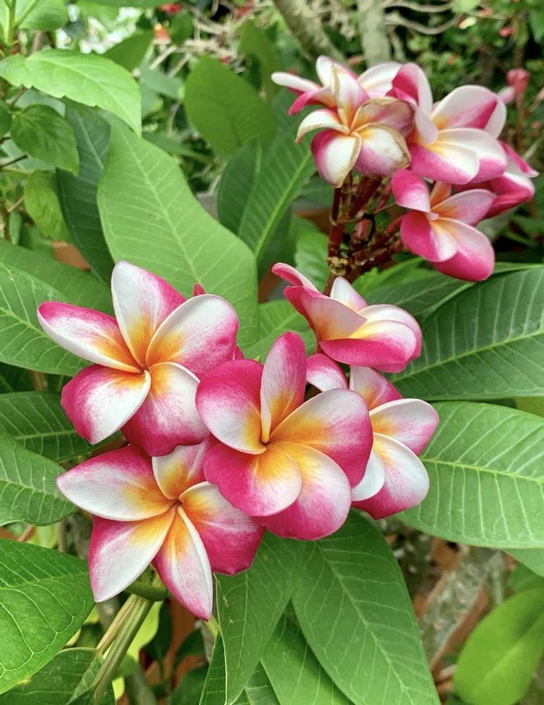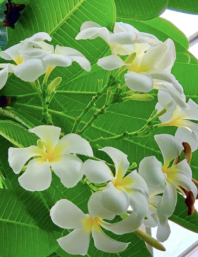 明るい日差しの下で、枝の先にたくさんの花が咲いていたプルメリアの姿は、やっぱりオシャレでの美しさですね♡