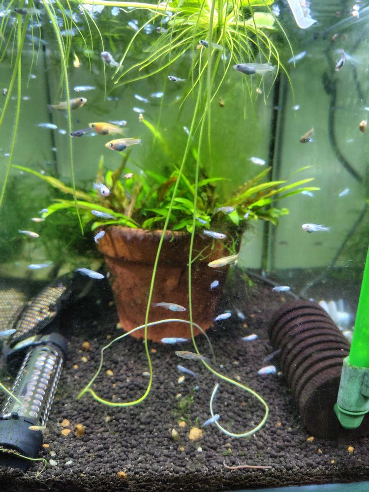 ここにいるメダカは産まれて約1ヶ月です。この水槽には3〜40匹います。☺