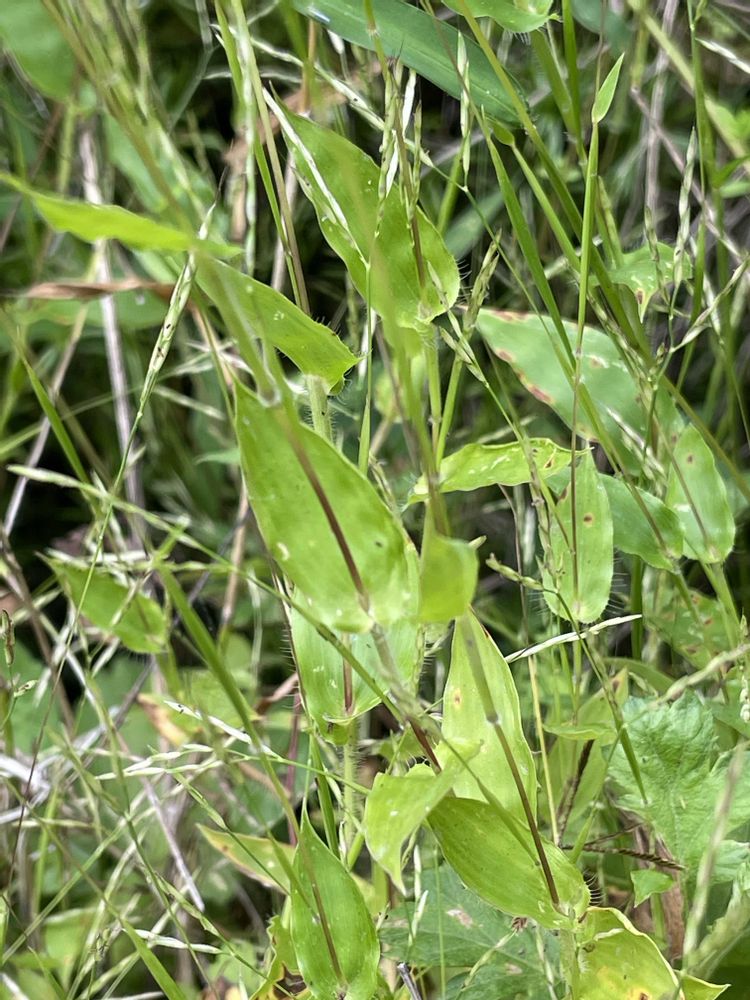 葉は長さ2~6cmで基部は茎を抱いて葉鞘に移行して、葉の縁は大きく波打っている。縁に毛があり、特に基部に近い部分では硬くて長い毛がまばらにあってよく目立つ。