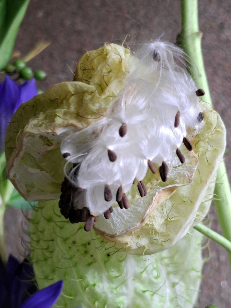 玄関、トウワタのタネまみれになって後始末が面倒でしたよ😵