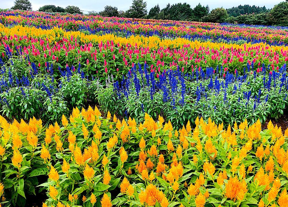 眼前に広がるなだらかな丘の斜面を、カラフルな秋色で彩っていた「鶏頭(ケイトウ)」で、おはようございます🍃🧡💛☺️🩷❤️🍃