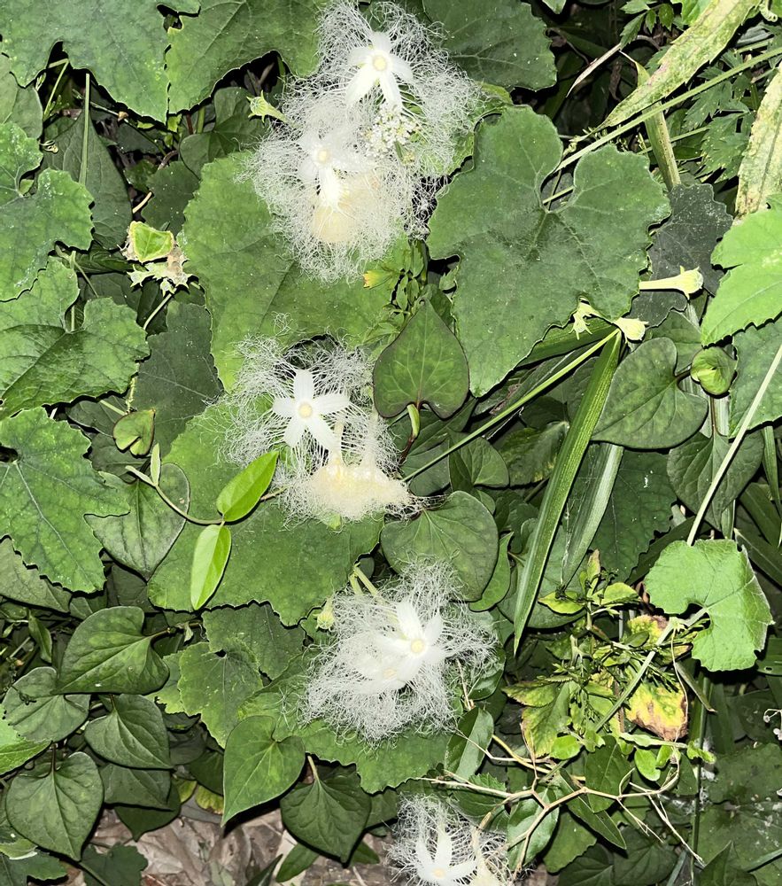 ✨今日のお花✨の🌿🩷ナンバンギセル🩷🌿がどこにも無くて見つけられなかったので代わりに、今年の夏(7月)の夜に、いつもの散歩道で撮影した🍈カラスウリ🍈のお花を投稿しますね👍
