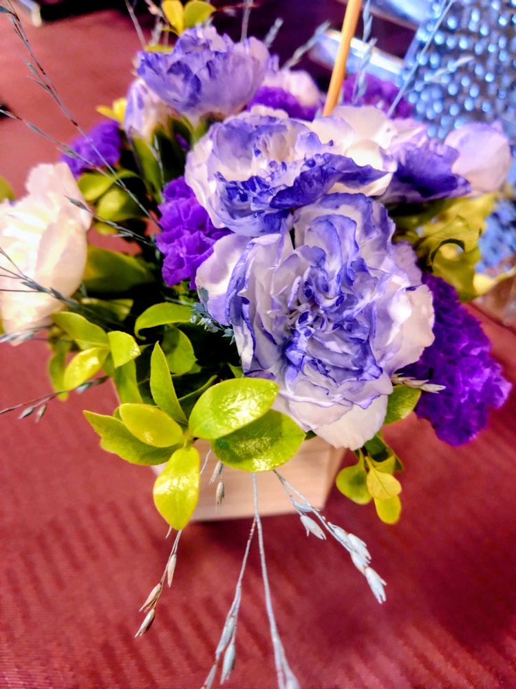 紫色にスプレーしたカーネーションとスターチスの組み合わせがセンス良くて綺麗で素敵でした✨✨‼️