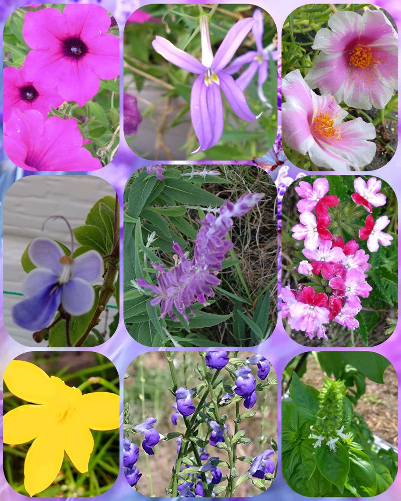 左上から時計回りにサフィニア、イソトマ、大輪松葉牡丹、バーベナ、スィートバジル、コバルトセージ、黄花玉すだれ?、クレロデンドルム、アメジストセージです😊💞💞