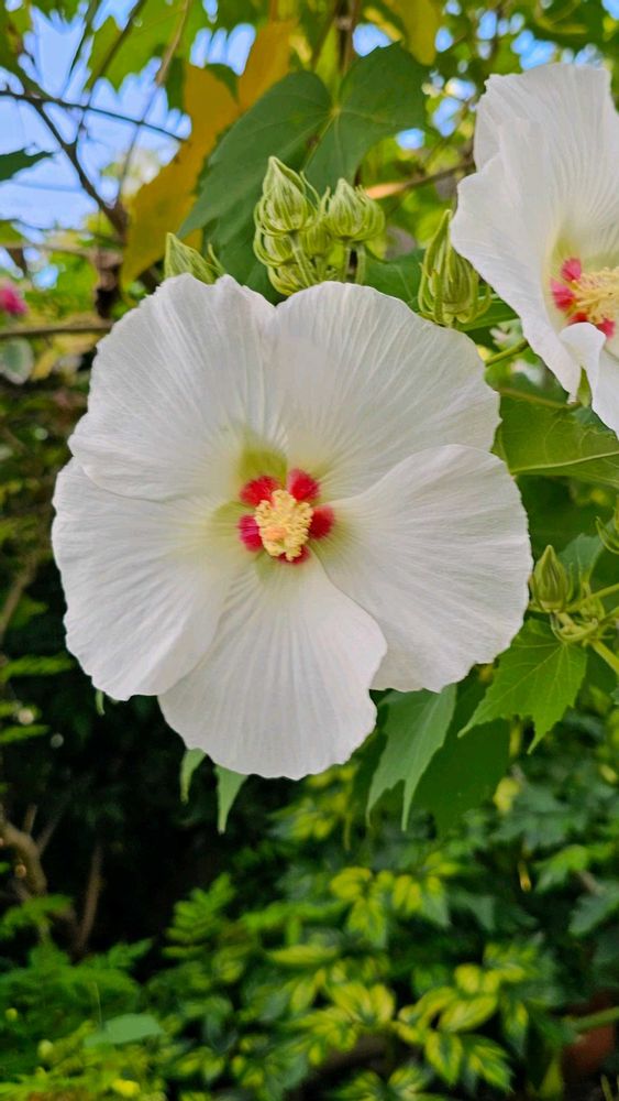 酔芙蓉としては少し変わっていて、 原種なのか、悪く言えば出来損ないかも知れないけど。朝🌄は白く咲き昼頃はうっすら赤みが挿して夕方は赤くなり