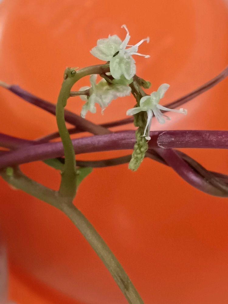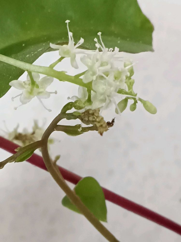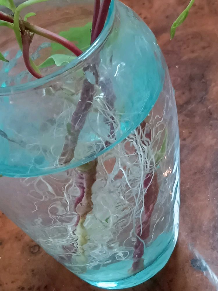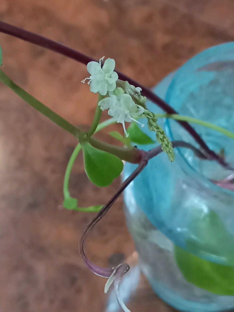 オカワカメを剪定しました…茎を花瓶に入れていたら根が出てきて、お花も咲き出しました〜なんて強いのでしょう✨️💪🌿💚🤍🌱