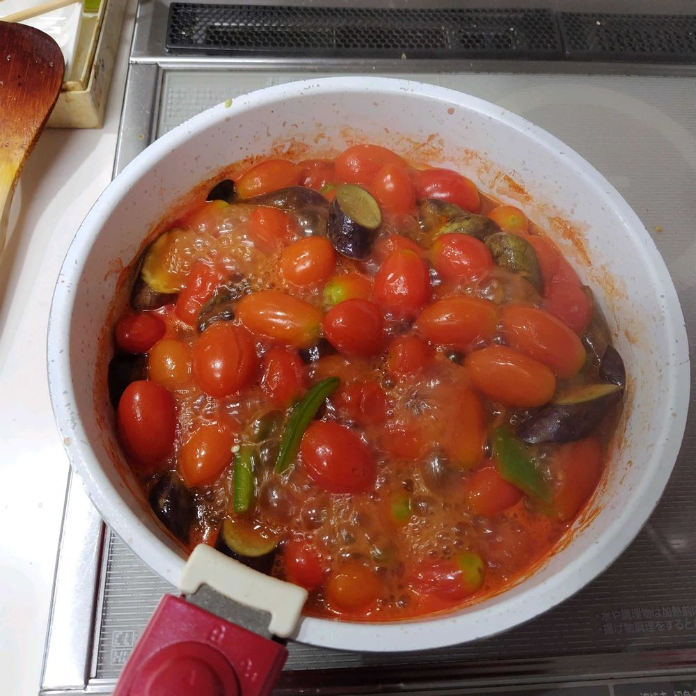 5枚め…トマト🍅の苗を片付ける前に、収穫したトマト🍅をラタトゥイユに…😋👌