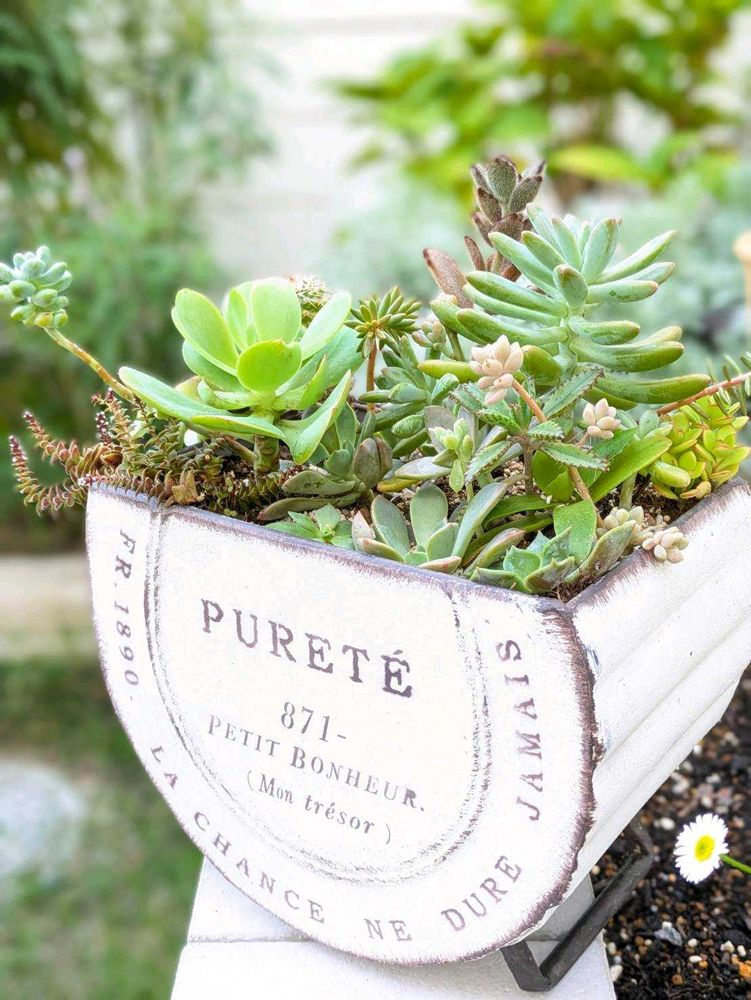 1つ目の寄せ植えは塀にかけて、2つ目は多肉花壇を作る予定の場所の脇に置きました
