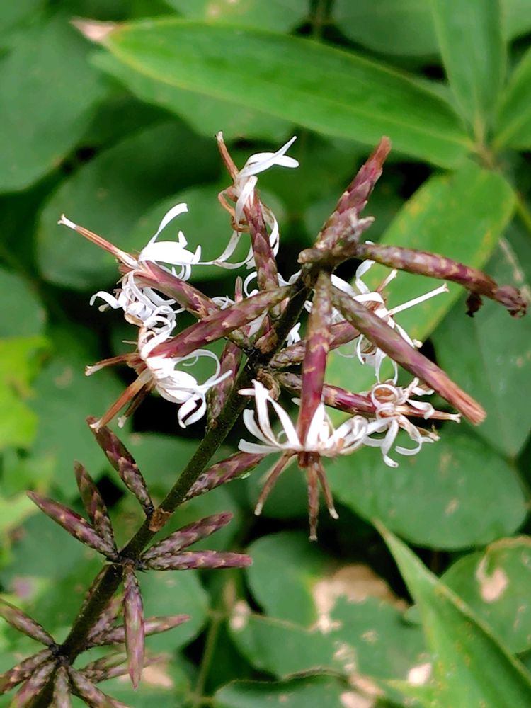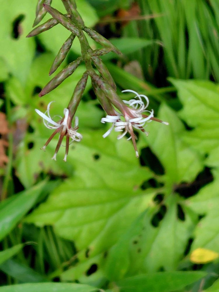 頭花は3個の筒状花からなり、花冠は白色で4〜5裂し、左右対称。裂片は線形でよじれる。