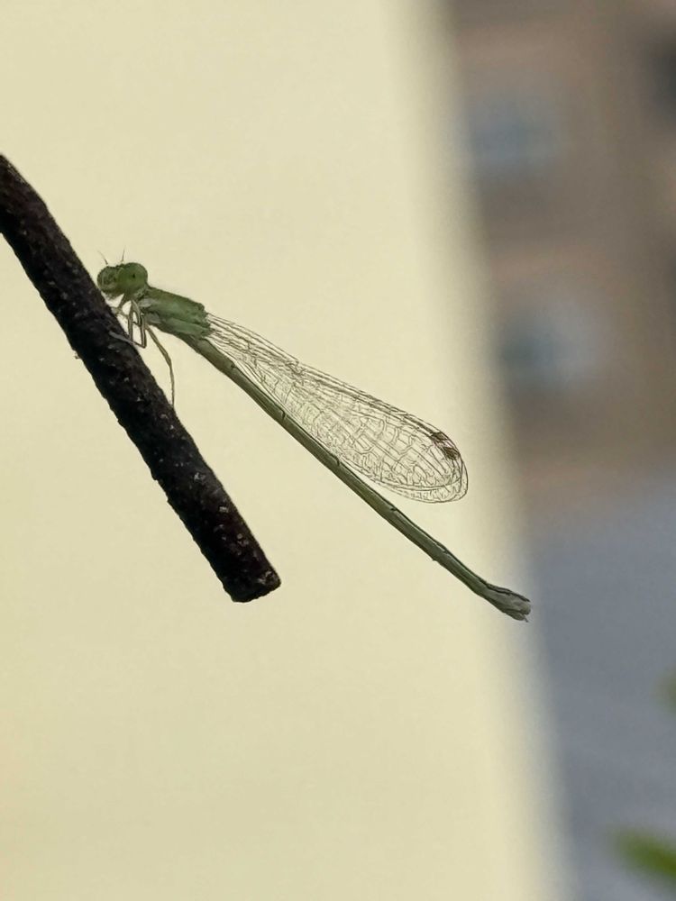 ⑤ベランダで水遣り中にイトトンボが避暑に来ました☺️