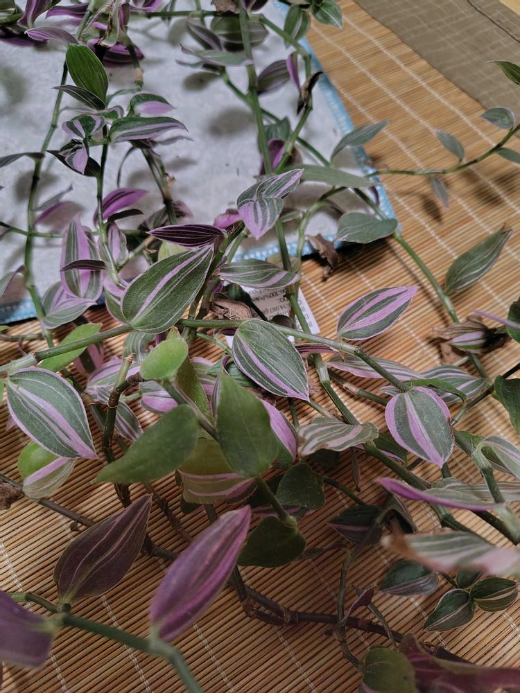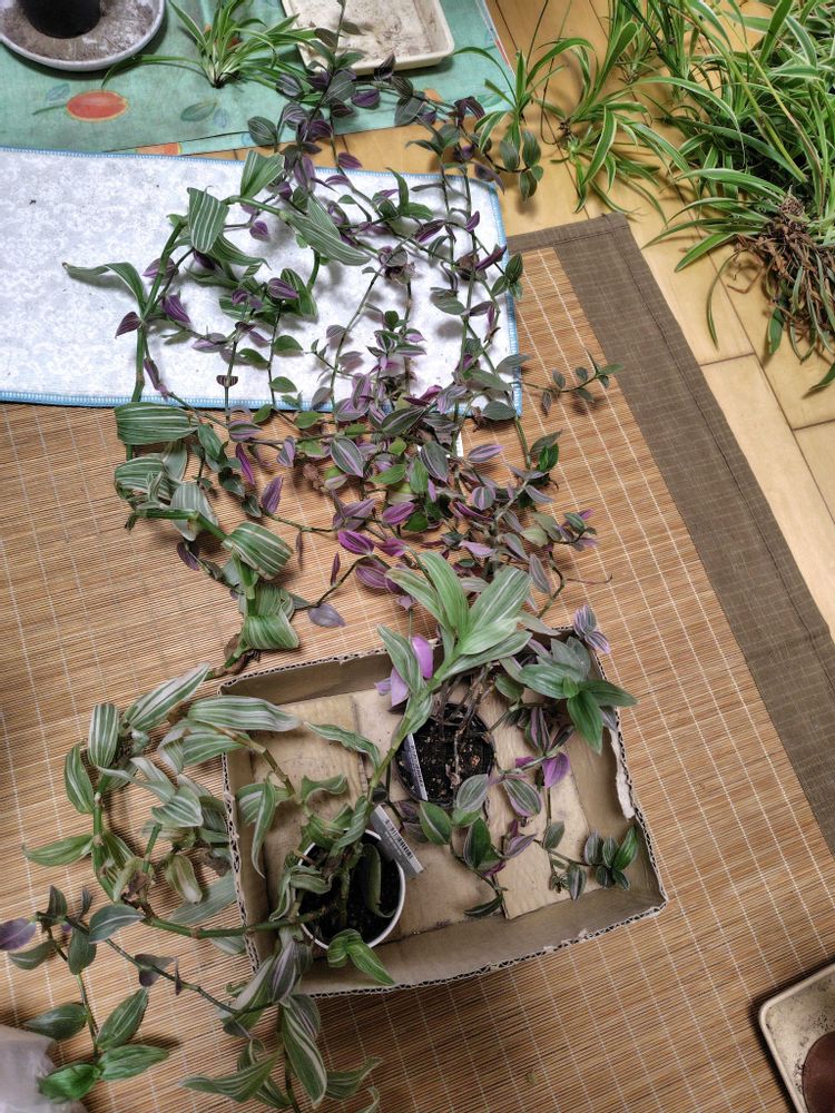 下に敷いてあるのは、吸水マットです。このコたちの上にぶら下がっているエアプランツ達のお水やり🚿した後にみずが垂れても大丈夫なようにしているのですが、ふかふかのこれの上にトラディスカンチアさんが伸びてます。おふとん状態🛏️🤣。