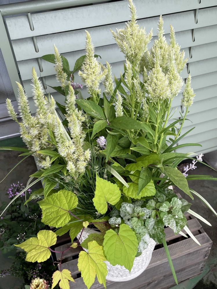 白い鉢に合わせて、グリーンとパープル系がいいかな、先生の渋谷さんが作られるような寄せ植えを作りたいな、とグリーンのセロシア中心に💚