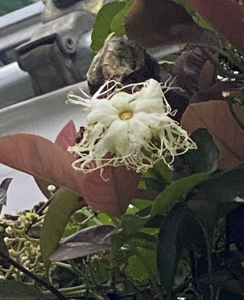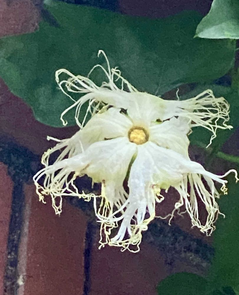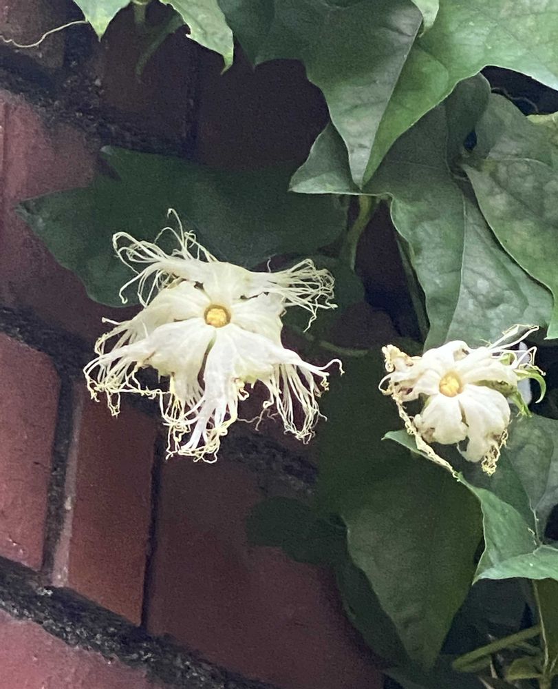 夕方から散策に出かけて、見つけたカラスウリの花 大きな道に面した大学の塀に絡んでました。