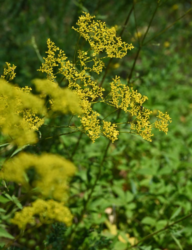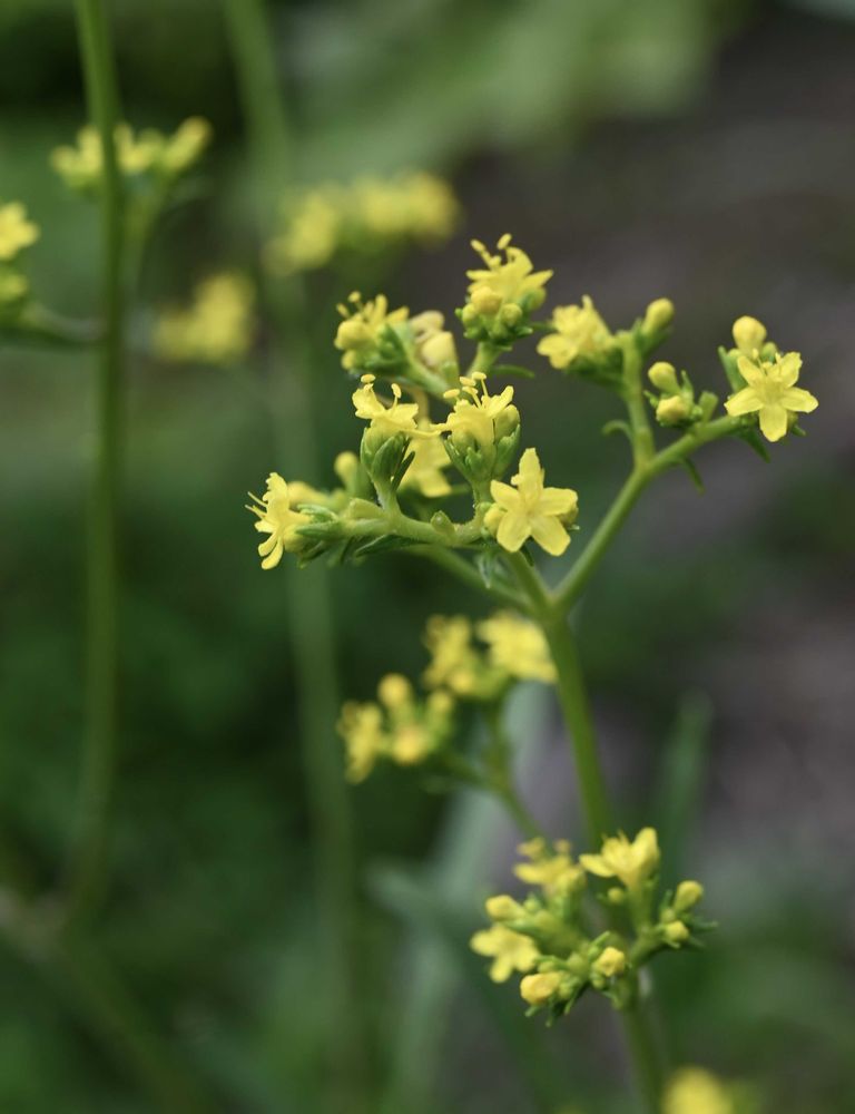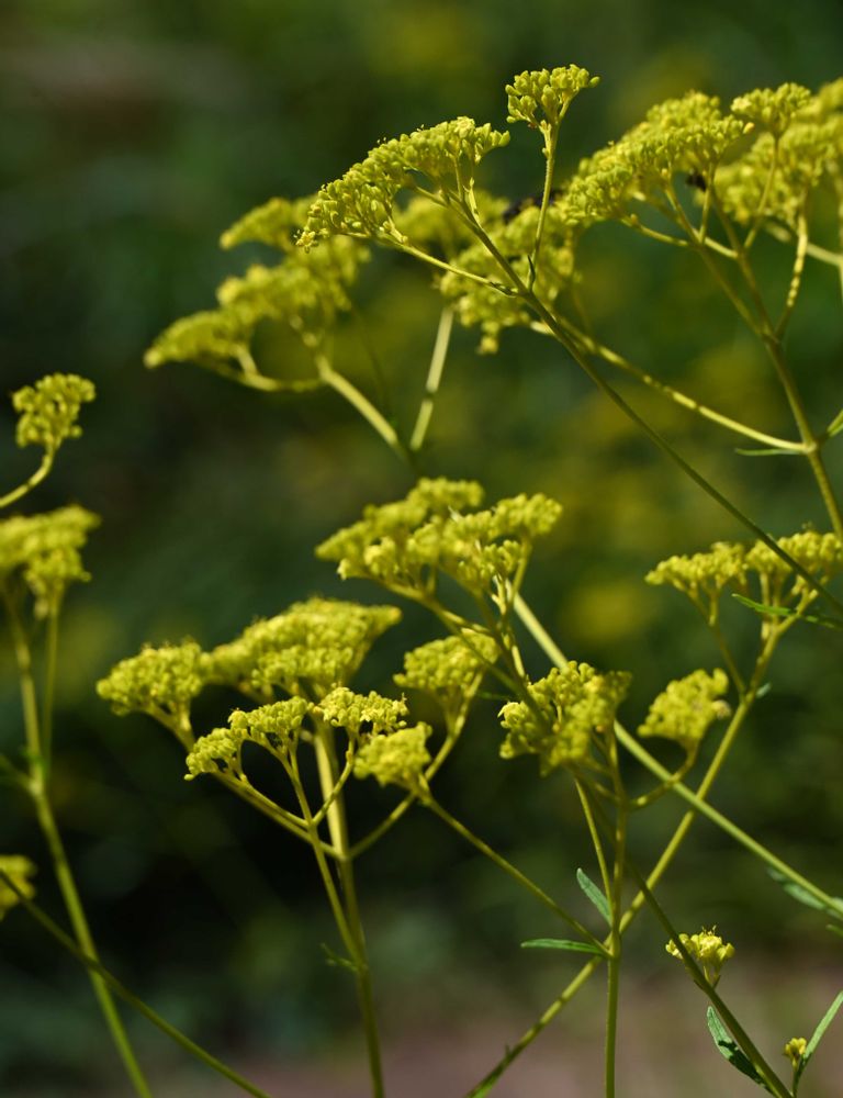 茎の上部で分枝して、花茎の先端に黄色い小花を平らな散房状に多数咲かせる。