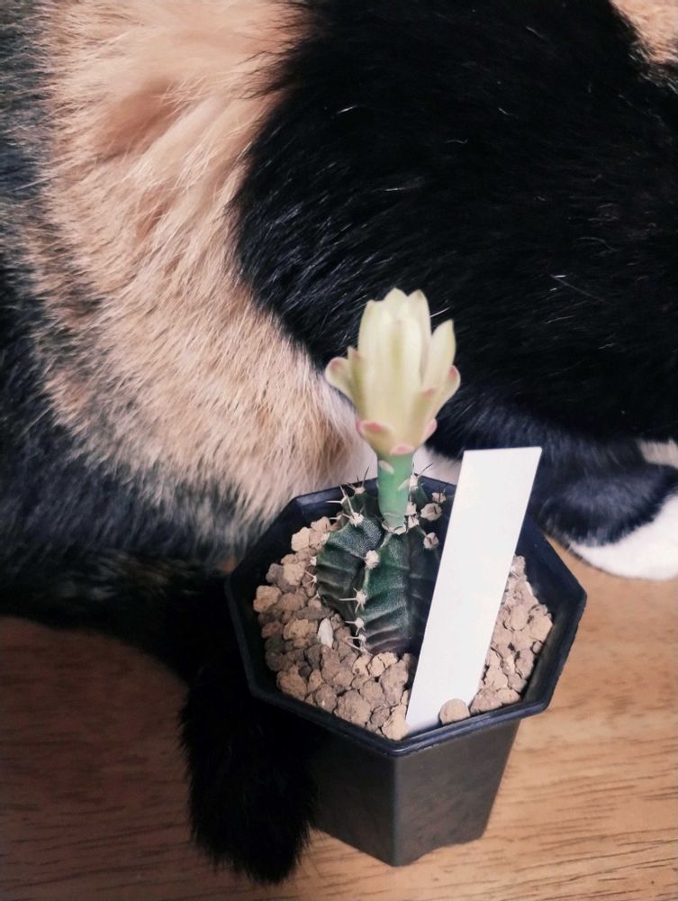 先日訪れたサボテン屋さんで、ツボミ付きのこのコを夫が欲しそうにしていたので購入しました😆(背景のモフモフは帰宅後早速チェックに来たネコさまです)
