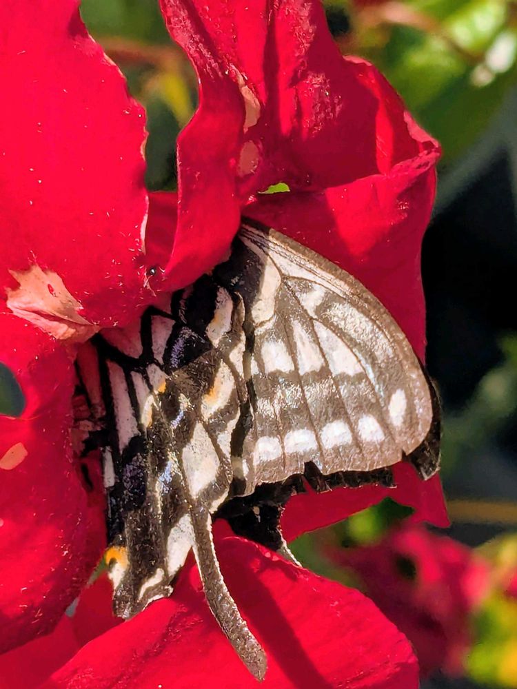 マンデビラの花に半身突っ込んだ状態のアゲハチョウ…