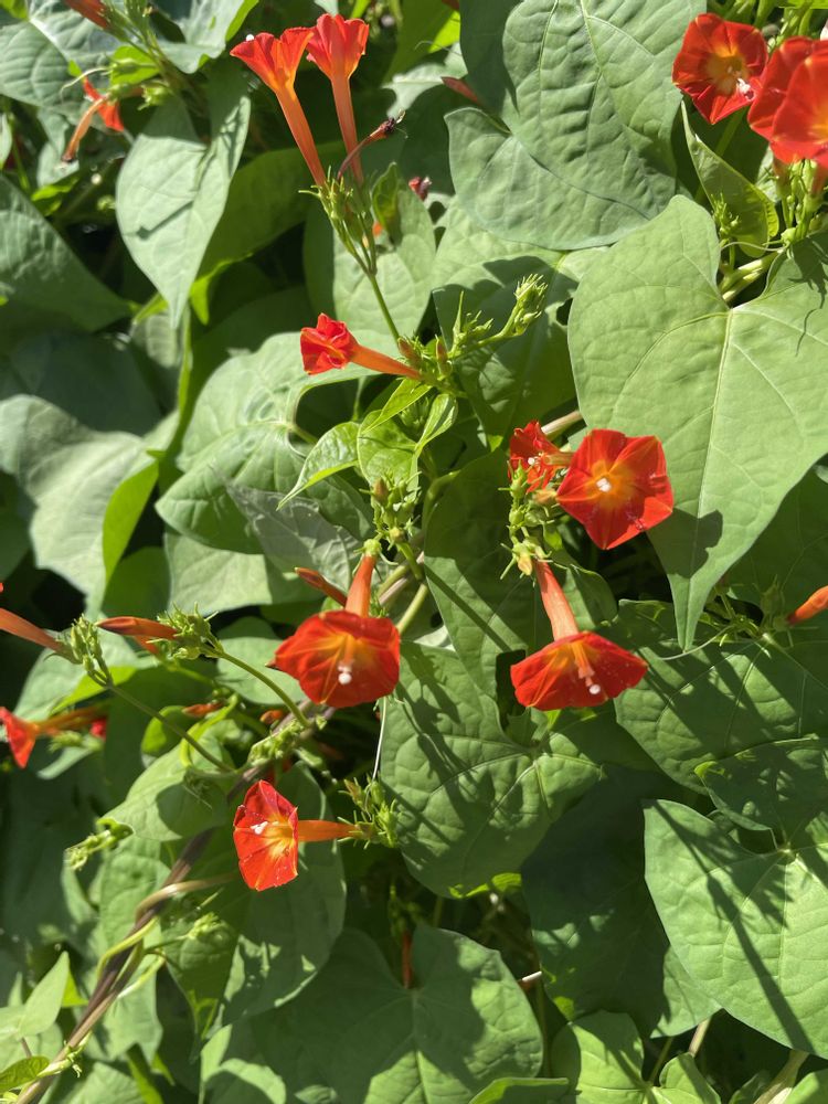 ガードレールに絡みついて鮮やかなオレンジの花を咲かすマルバルコウ🧡