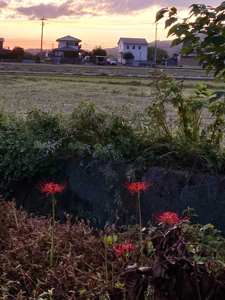 それでも、たくましく生き残った彼岸花を、朝焼けを背景にパチリ☆・・