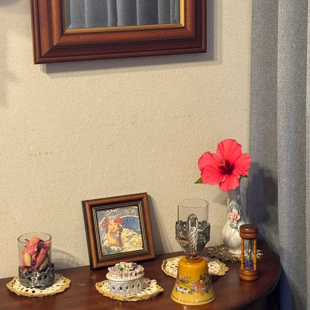 インテリア仏壇「鏡壇ミラリエ」「鏡壇ミロワ」に今日(9/22)の誕生花の「ピンクのハイビスカス(仏桑華)」 を飾ってみました。